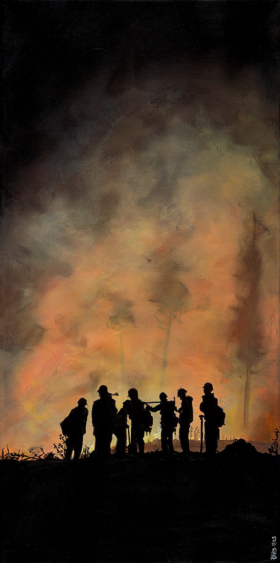 The focus of this painting is of the squad and ultimately the crew. That is why no individual is singled out. It takes the whole crew to make the picture and to get the job done. But, more than the work, it‘s the bond created between them. That is the real message. They aren’t cutting line, burning, gridding or holding, they are passing time.