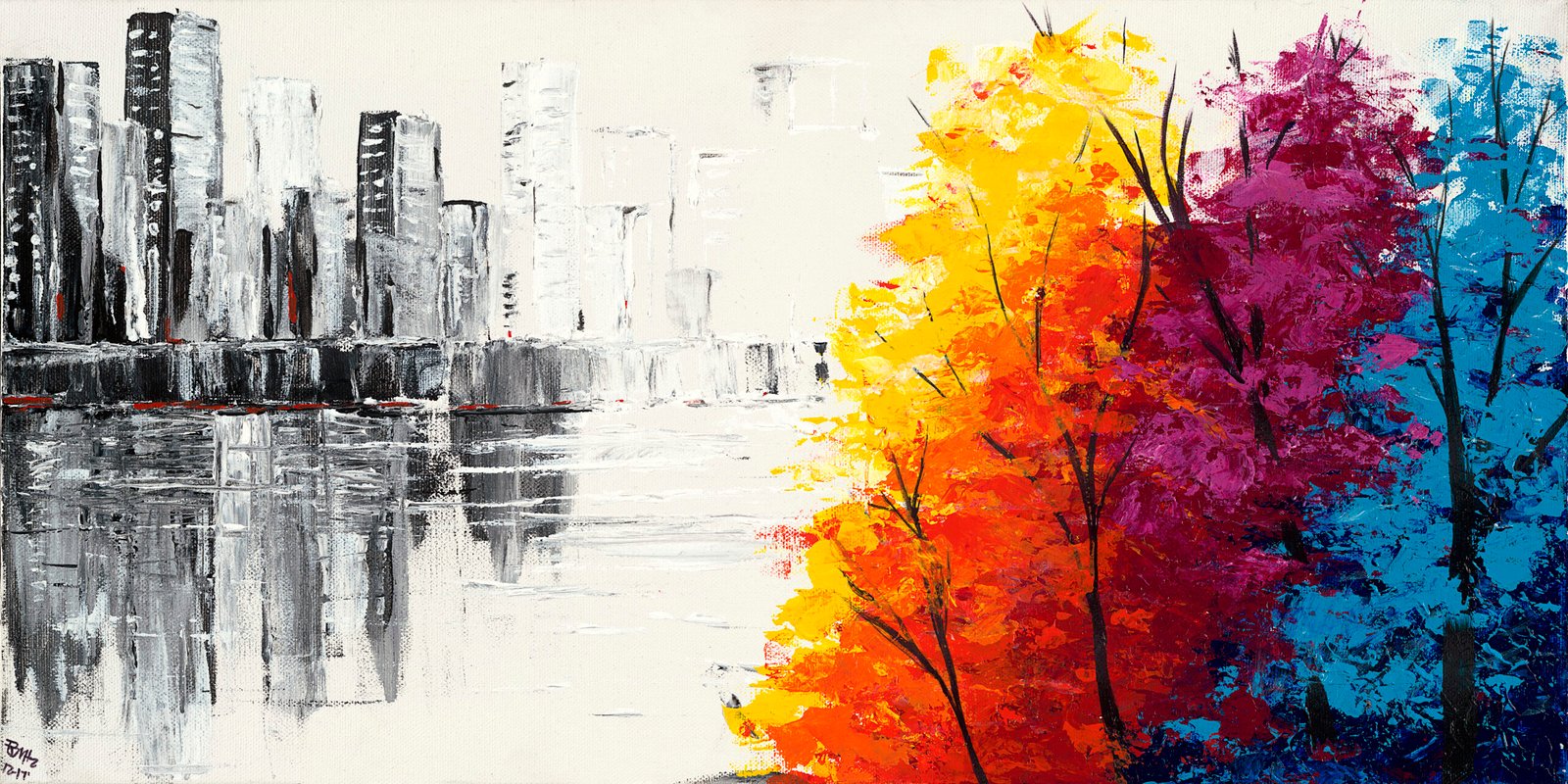This painting was created not to show the clash between the urban environment and nature but to compliment their relation. Without the black and white city the trees would not be as vibrant. I wanted them to have equal weight and equal detail because they are both needed to complete the painting.