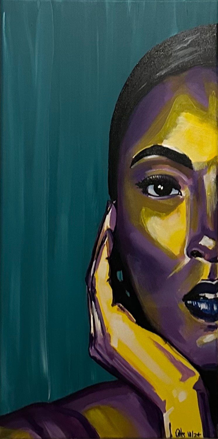 The parameters of this work was to paint the portrait of the model using a complimentary triad, a shade of yellow, purple and blue/green. The background is the blue/green color, what would be highlights are in the yellow, and the purple is used for the darker tones.