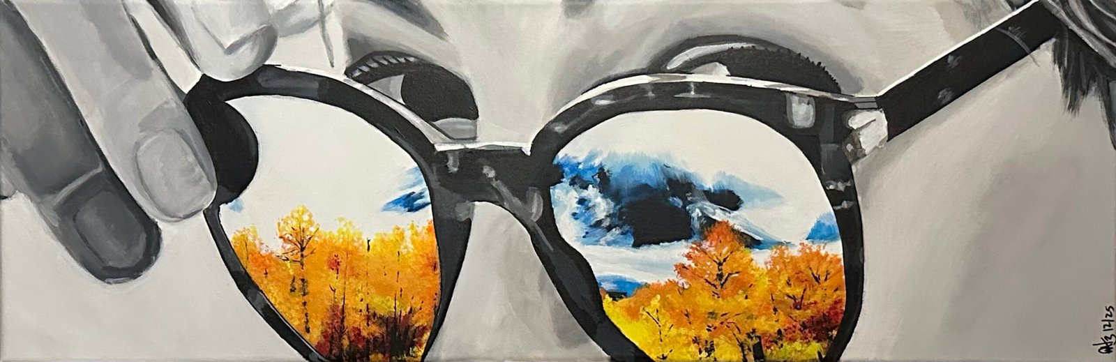 This work was created using different techniques, brushes and pigments markers to blend or soften the model, to sharpen and separate the glasses and to ultimately create the foliage and mountains. Distant uses colors to catch the eye and the monochromatic color theme to keep it.