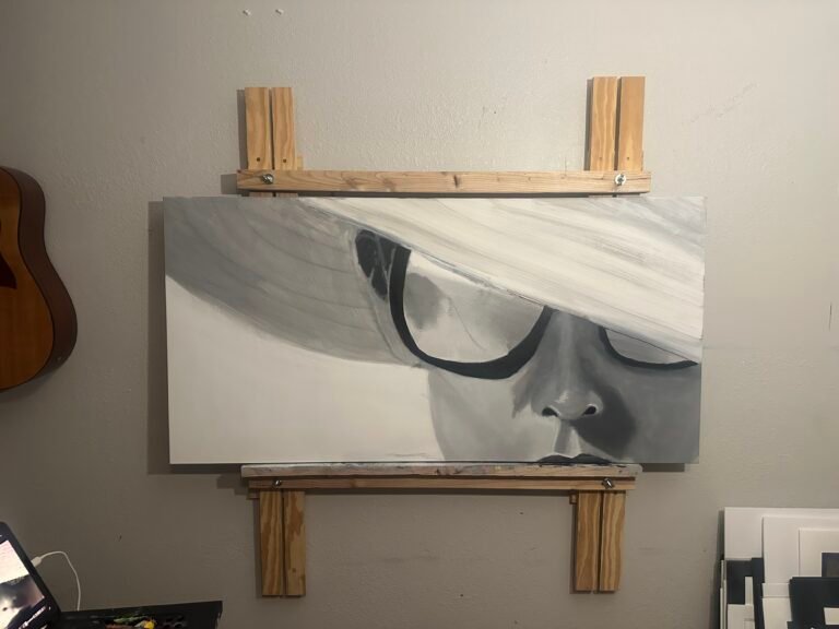 Next is my current project and a new piece that will be part of my Visuals Collection. This work has no title yet and has only its first of many layers of paint. It is a large piece that is 24inX48in. This work will follow the theme of a black and white figure with a brilliant image reflected in her glasses.
