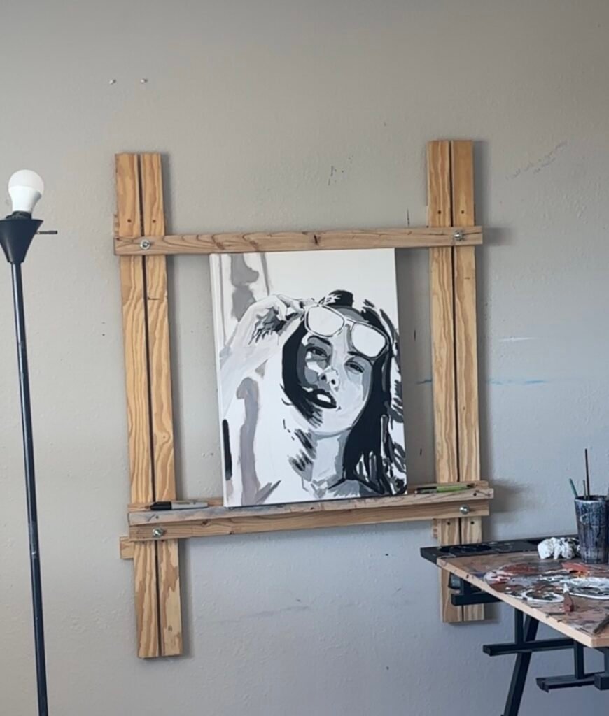I zoomed out on the sunglasses for this one. This is still going with the same theme of black and white with color. I was able to sketch this up here and there throughout the weeks. This one does not have a name yet. I do think I have 2 to 3 more paintings in me of this theme, and then I will be good to move on to something else. Any suggestions for what to reflect for this one and the next 2?